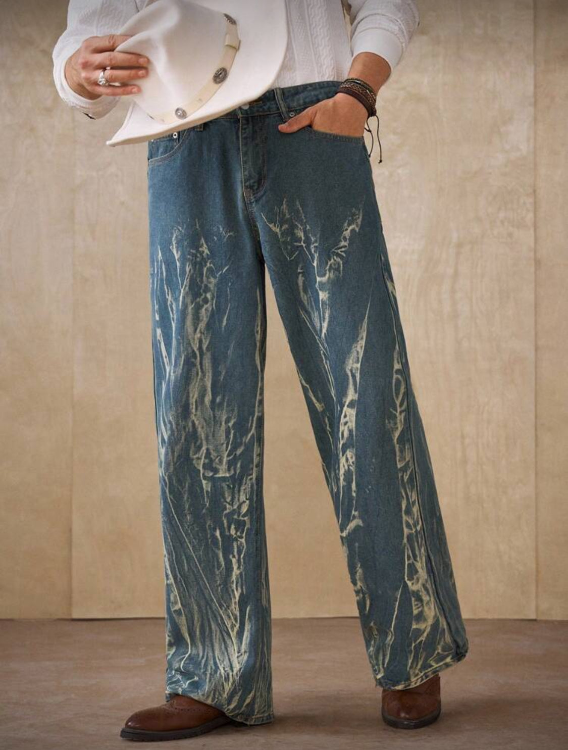 RivetRise Jeans rectos para hombres con lavado desgastado azul-verde, estilo casual de calle, primavera/verano