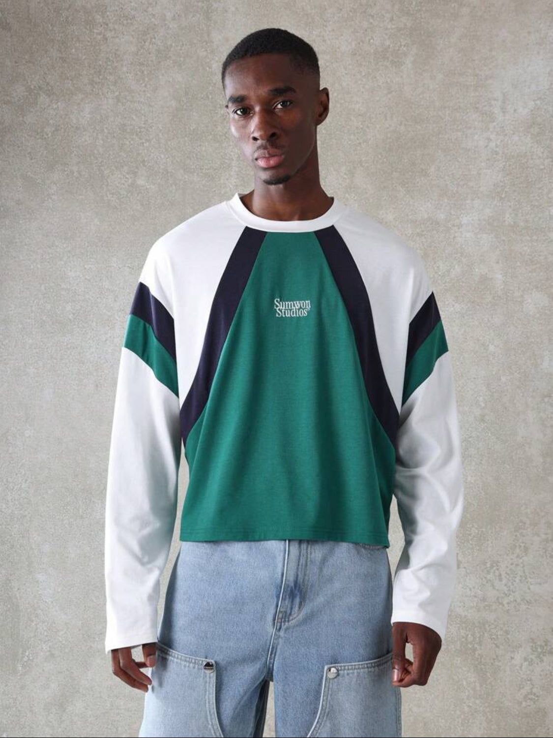 SUMWON Camiseta de manga larga con corte ajustado y diseño de bloques de color de Sumwon Studios, moda urbana y deportiva, estilo casual y retro, para primavera y otoño